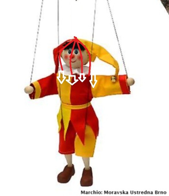 Una marionetta per mantenere la postura eretta deve rimanere sospesa senza toccare il pavimento, con ogni sua parte sostenuta da fili collegati a travi o alle dita delle mani.